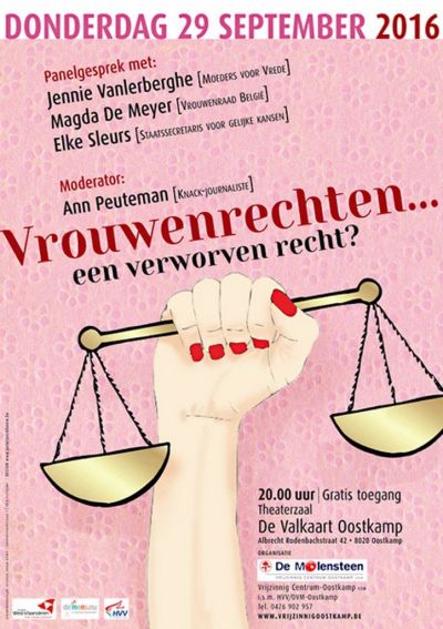 Ondanks al deze inspanningen blijft het respect voor de gelijkheid tussen mannen en vrouwen als mensenrecht wereldwijd problematisch. In heel wat culturen en religies blijven vrouwen ondergeschikt aan mannen. De komst van een massale vluchtelingenstroom van mensen uit deze culturen, de gebeurtenissen op oudejaarsavond in Keulen en andere Europese landen zetten de blijvende erkenning van de gelijkheid tussen mannen en vrouwen onder druk. Deze confrontatie maakt dat mensen heen en weer worden geslingerd tussen hun humanitaire plicht om vluchtelingen te helpen en hun vrees dat onze cultuur met o.a. de gelijkheid van man en vrouw belaagd wordt. Wat kunnen we hiertegen doen? Hoe geven we deze vrouwen een stem? Hoe bewaren en beschermen we de vrouwenrechten in onze eigen maatschappij? Zal onze westerse democratie sterk genoeg zijn om de mensenrechten zoals wij die kennen te behouden en aldus o.a. discriminatie van vrouwen en racisme te voorkomen? Op dit alles zoeken we een genuanceerd antwoord met een uitstekend panel van vrouwen met een reputatie op gebied van de verdediging van vrouwenrechten niet alleen nationaal maar ook wereldwijd.